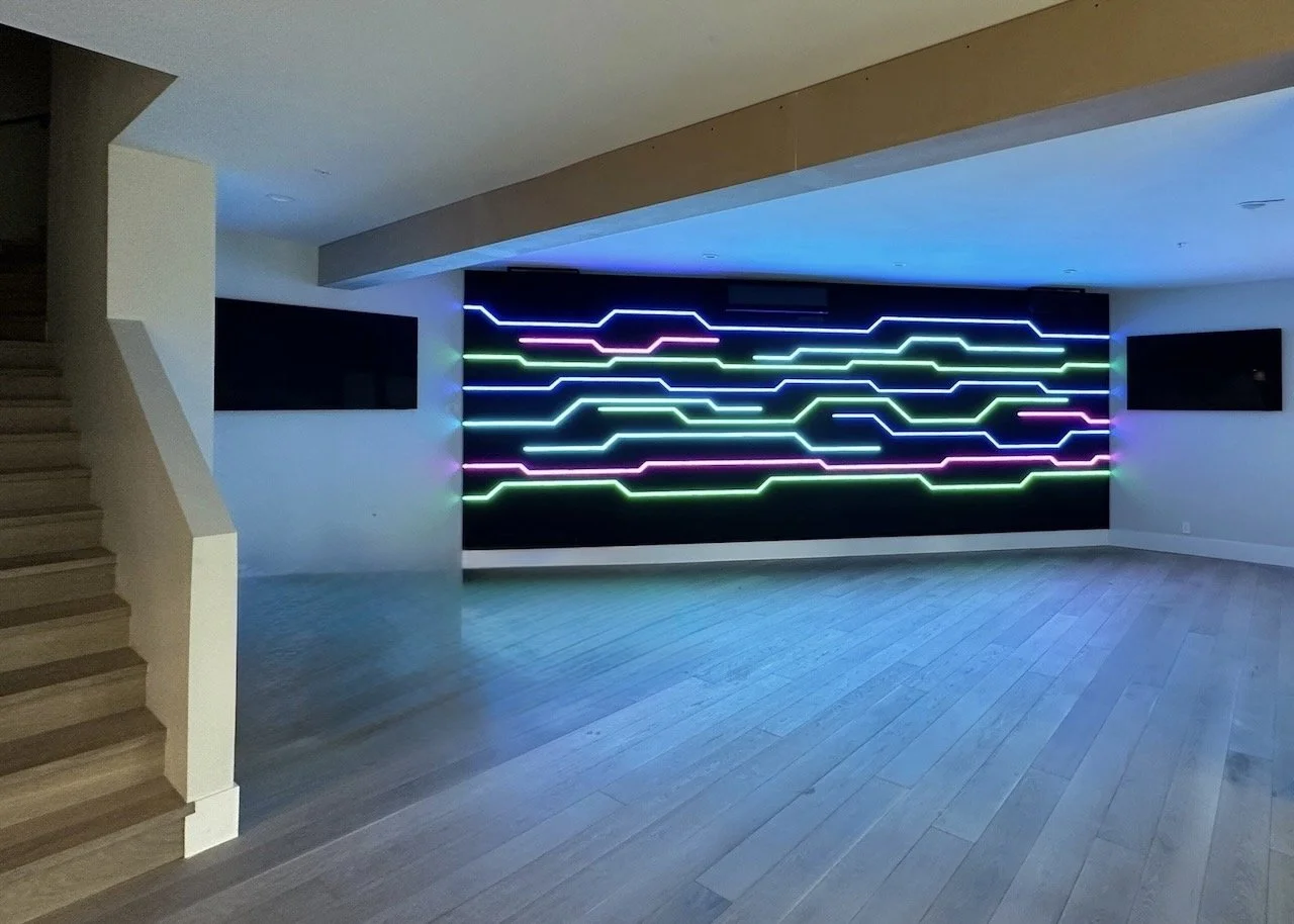 The entire home was rebuilt around a bold black-and-white palette. The basement was transformed into a high-end man cave featuring a custom wine room, full bar, recording studio, and RGB lighting to set the mood for both entertainment and creative work.
