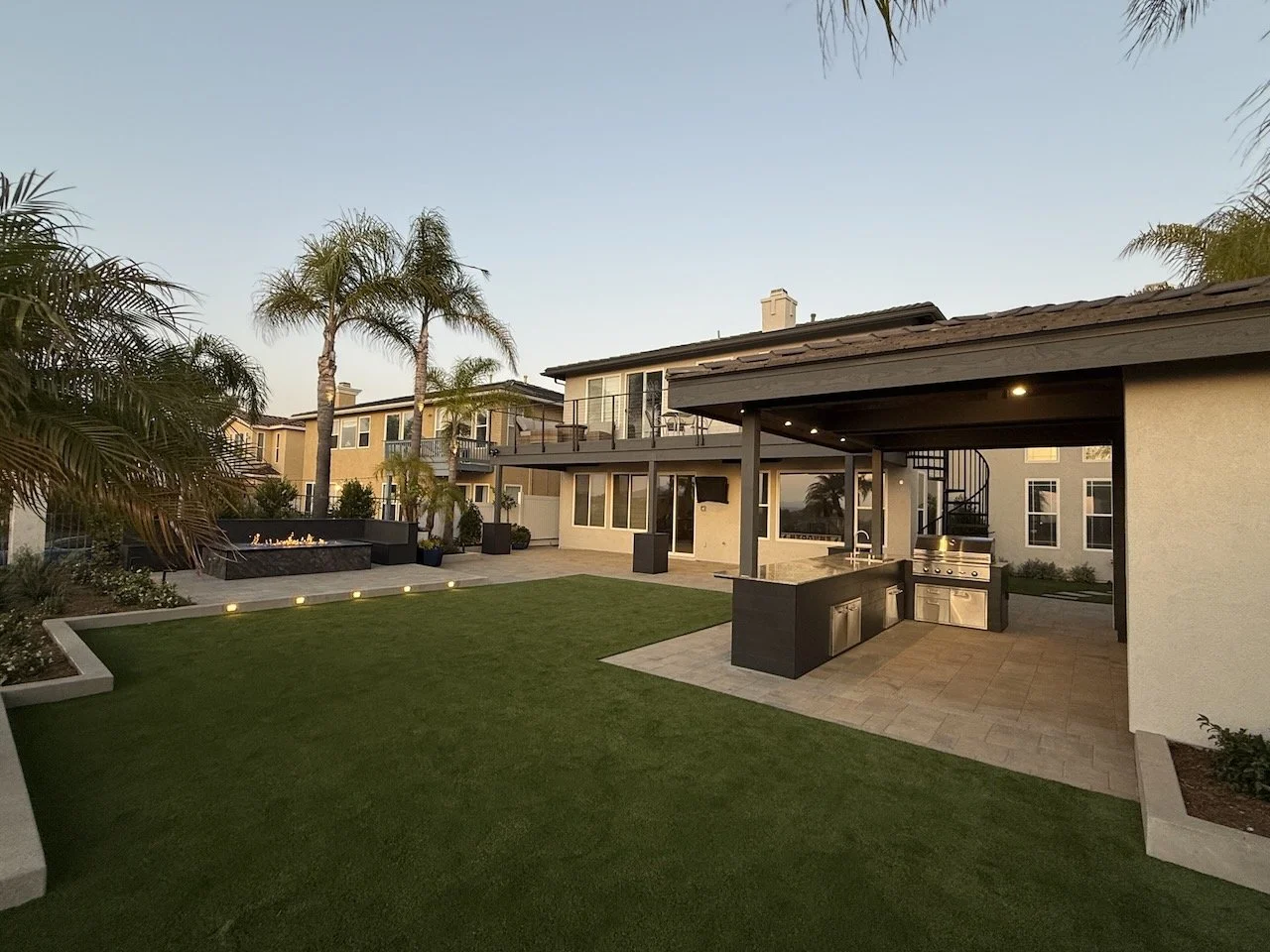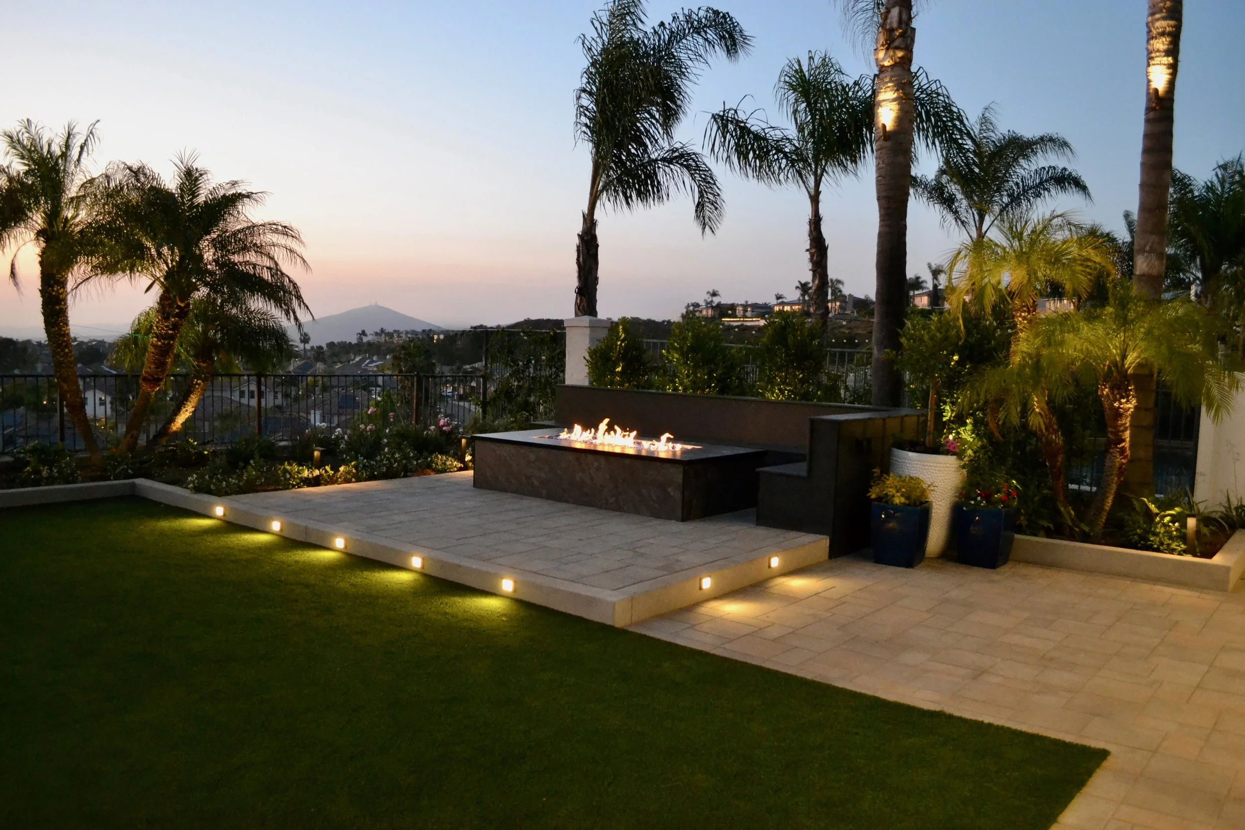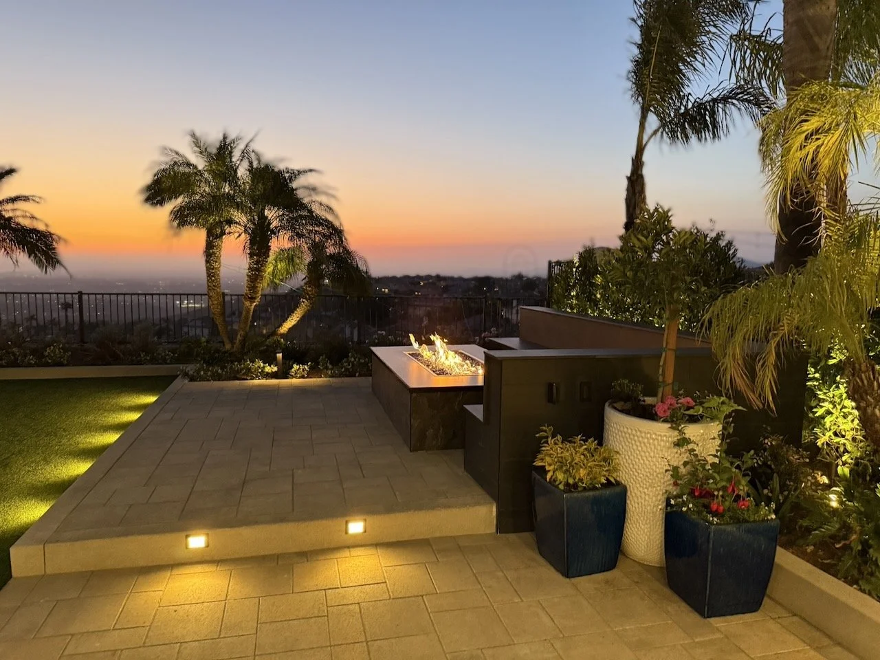 A large custom fire pit with electric ignition is surrounded by expansive seating, creating a natural hub for gatherings. We installed pavers, artificial turf, and integrated lighting—both in the planters and on the palms—to add structure, dimension, and atmosphere. Lush new landscaping brought balance to the space, replacing overgrown palms with vibrant tropical greenery.