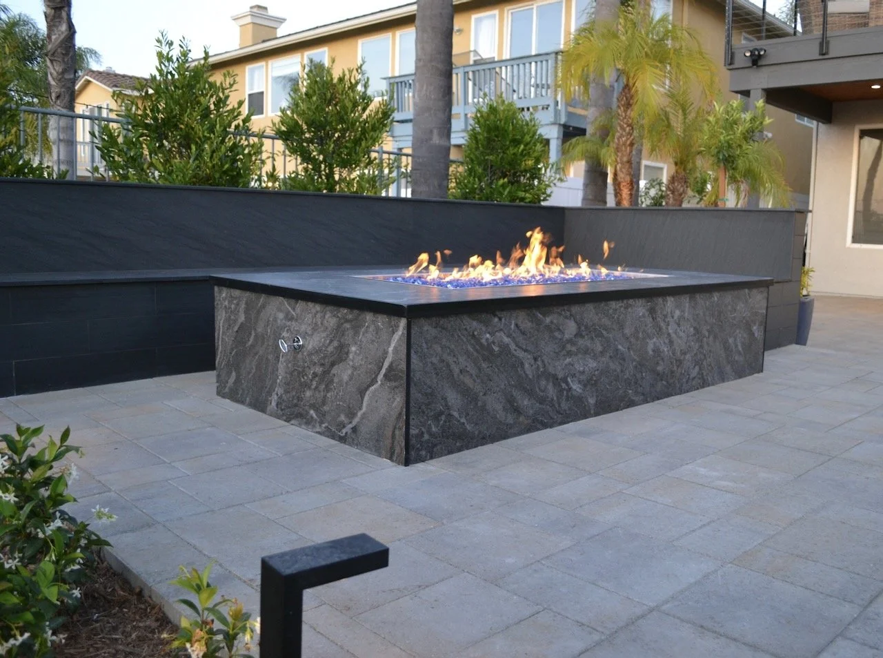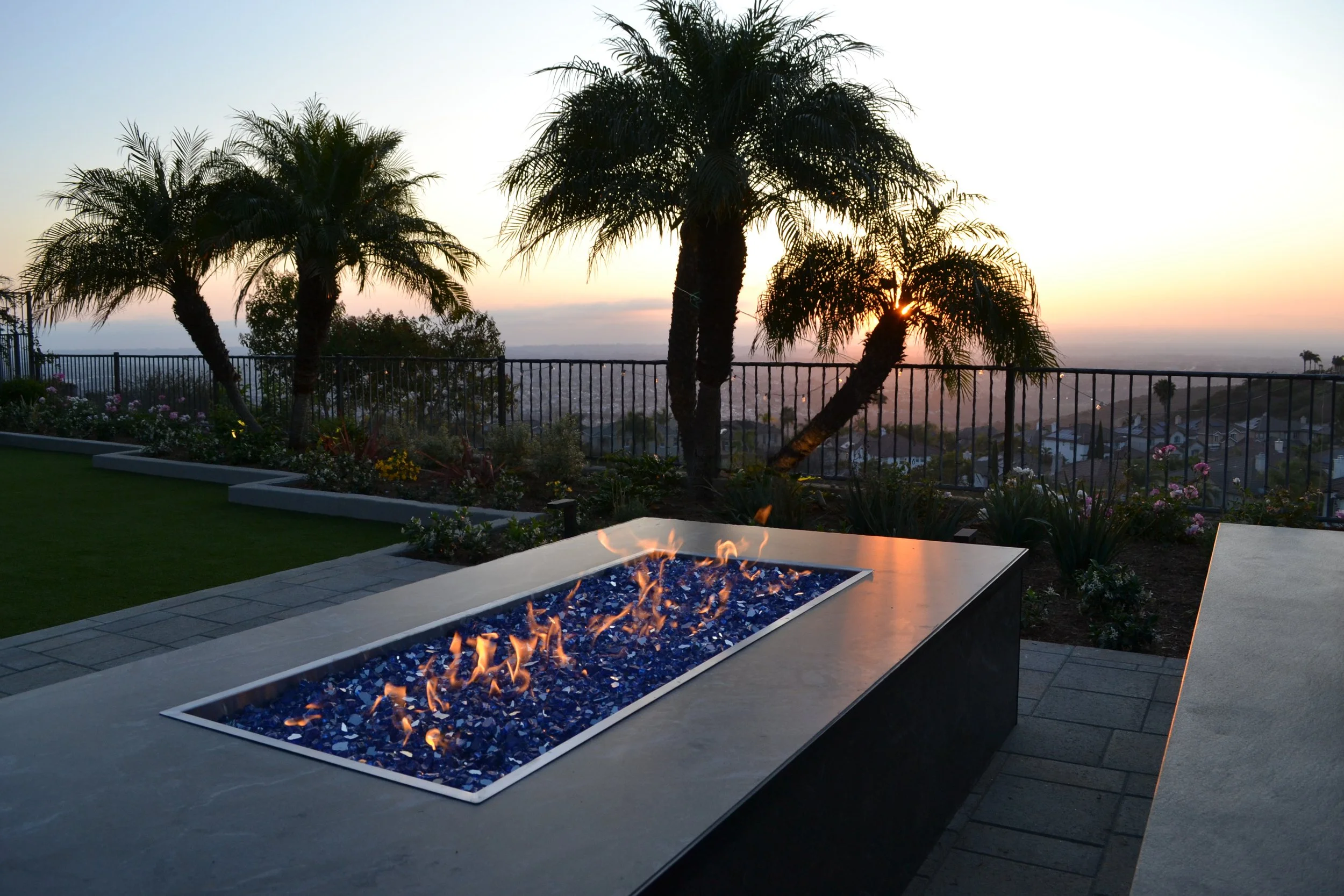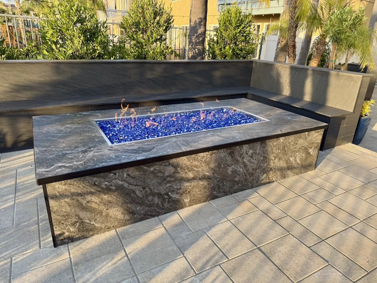A large custom fire pit with electric ignition is surrounded by expansive seating, creating a natural hub for gatherings. We installed pavers, artificial turf, and integrated lighting—both in the planters and on the palms—to add structure, dimension, and atmosphere. Lush new landscaping brought balance to the space, replacing overgrown palms with vibrant tropical greenery.