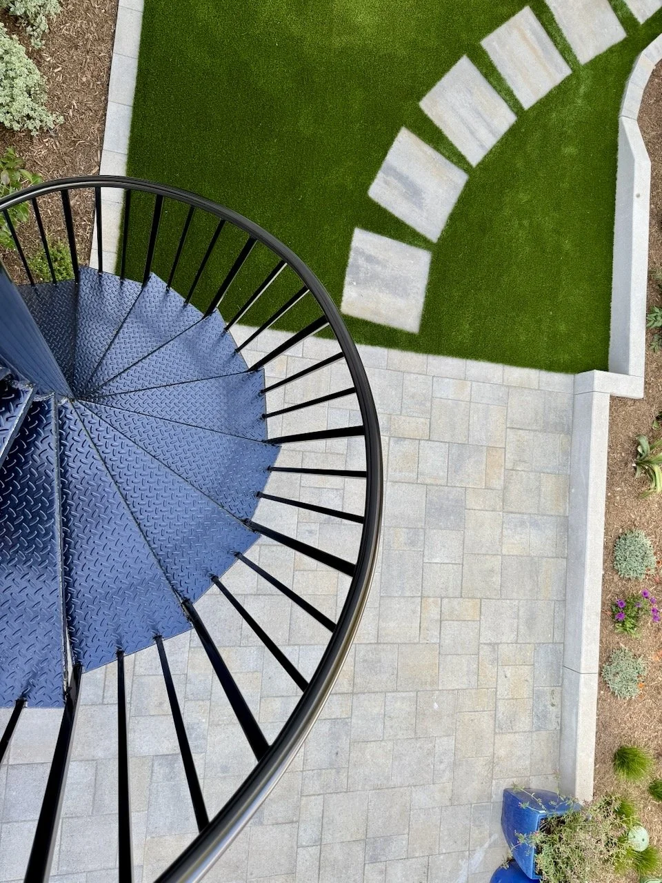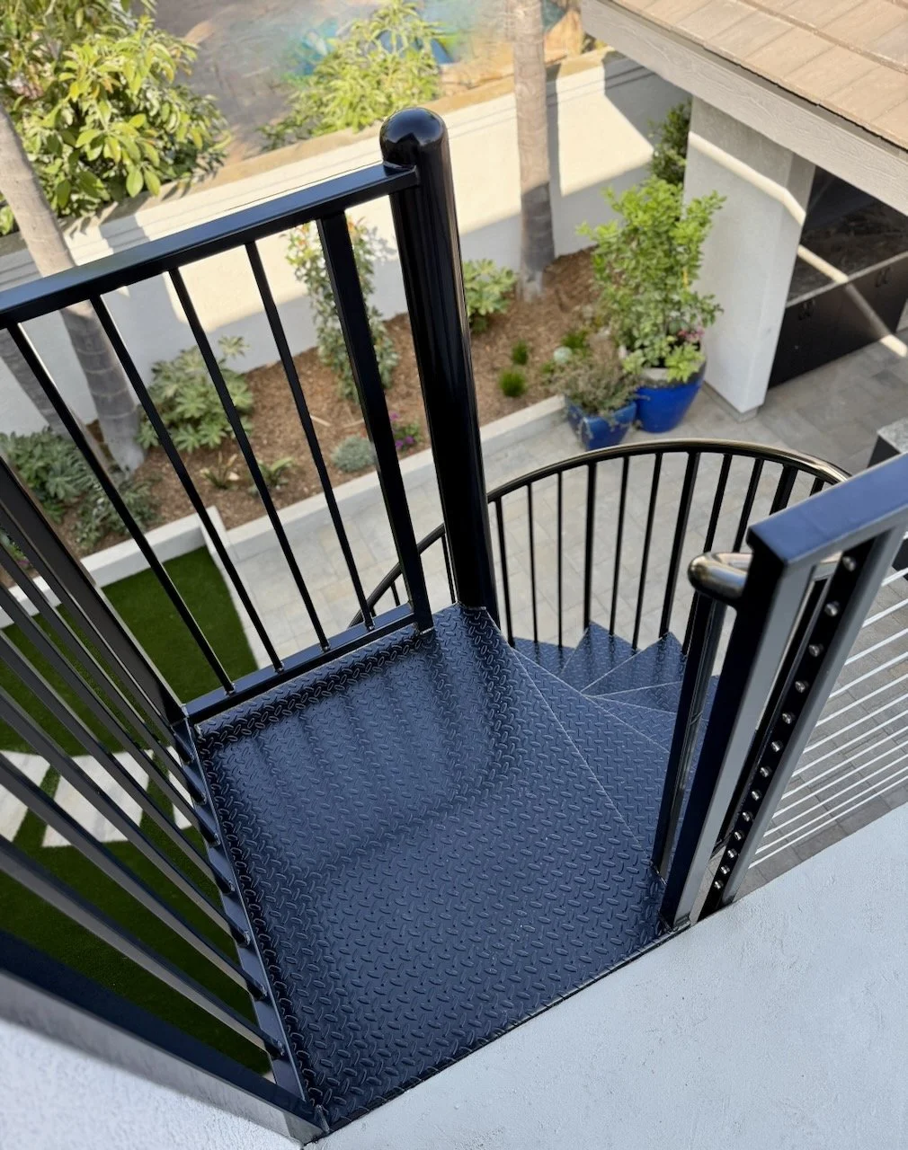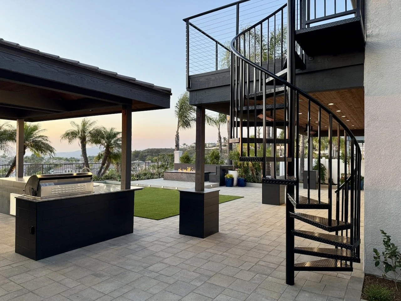 A key highlight: the once-small patio structure is now a waterproof upper deck with stainless steel cable railings and a custom spiral staircase—adding functionality, architectural appeal, and a prime new viewing platform.